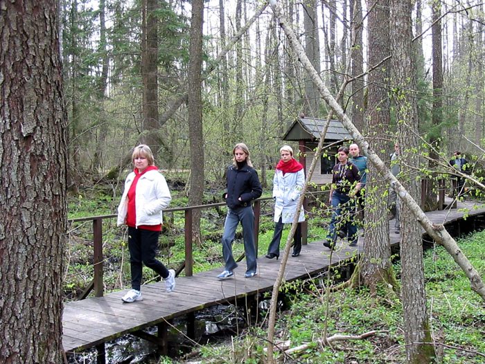 Так выглядит вторая пешая экологическая тропа. На этот раз путь пролегает через заболоченный участок заповедного леса. |