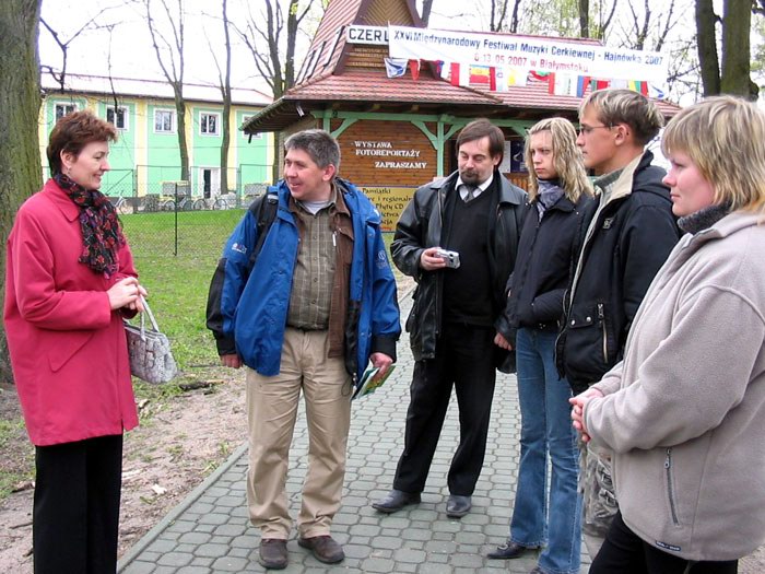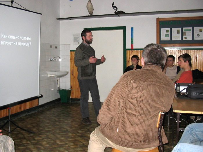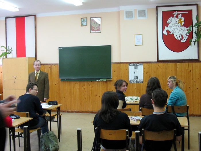 | По окончании экскурсионного тура белорусская группа посетила Белорусский лицей в городе Хайнувка. Георгий Козулько читает лекцию учащимся лицея о заповедном деле, о сохранении Беловежской пущи и о том, почему усилия экологов до сих пор не дают успешных результатов. |