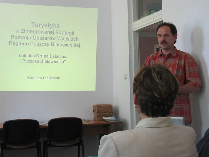 | 26 мая 2007 г. - начало семинара по подведению итогов Проекта "Пуща для велосипедов", который состоялся в образовательном центре в поселке Семянувка, что в польской части Беловежской пущи. | С докладом "Развитие велосипедного туризма в регионе Беловежской пущи в 2002 – 2006 гг." и "Велосипедный туризм и охрана природы" выступает руководитель Проекта с польской стороны Стефан Якимюк (Stefan Jakimiuk). |